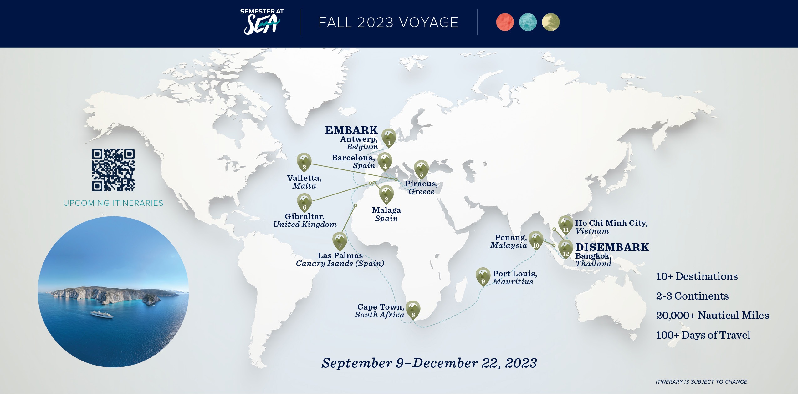 Join Semester at Sea as we sail to countries in Europe, Africa and Asia. You’ll experience a wide range of cultures and histories, setting sail from Antwerp, Belgium and disembarking in Laem Chabang, Thailand — with a whole lot in between — all while living and learning aboard a ship you’ll call home with a community that’s designed to build friendships for life.
